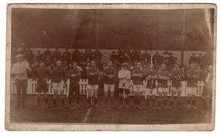 Probably the football team of 1/5th Battalion Lincolnshire Regiment, UK at Blundell Park, Cleethorpes, 22 October 1914, when they played a match against 10th Battalion Lincolnshire Regiment, UK. Goalkeeper Template:RefLives marked with a cross. Other team members: B. Smith, A. Atkinson, A. Corder, J.L Anderson, E.Parkin, W.Hatt, J.Hornshaw, E. Sunley, W. Quince, and C.W. Dobson.
